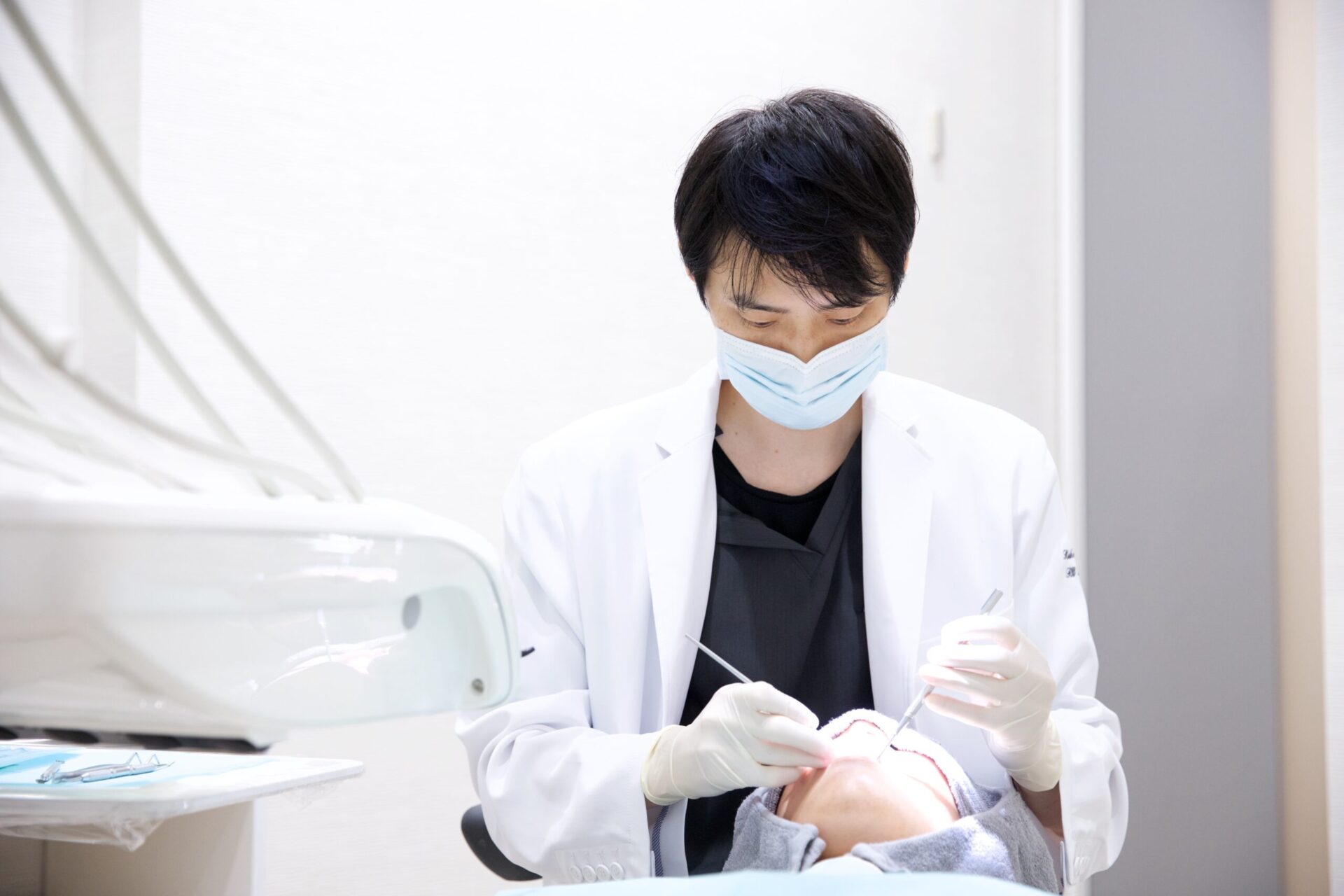 当院では、痛みを抑えるために、麻酔を用いて治療をしています。しかし、その麻酔自体が痛くては意味がありません。そこで、麻酔針を打つ箇所に表面麻酔を塗布することで、麻酔針が刺さる際の「チクリ」とした痛みを軽減しています。表面麻酔を塗布した後には、十分に時間を置いてしっかりと感覚を麻痺させていますから、ほぼ痛みを感じずに麻酔を注入することができます。
